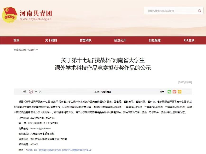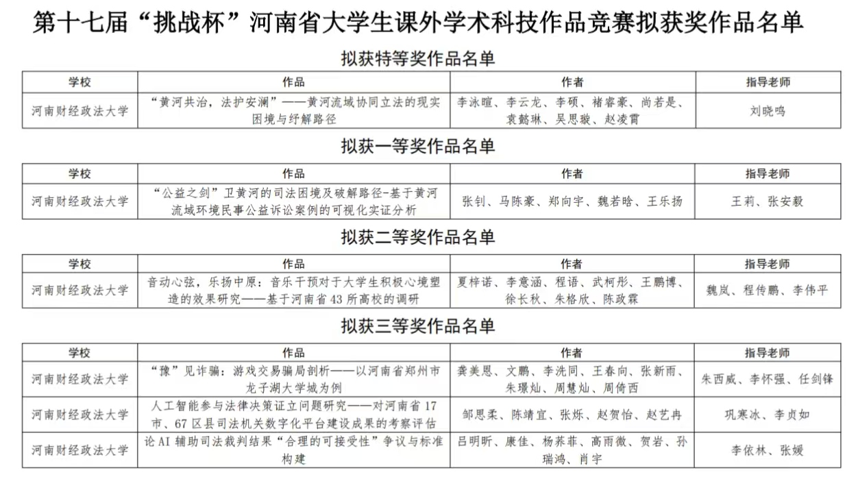 近日,河南省大学生课外学术科技作品竞赛组委会发布了第十七届“挑战杯”河南省大学生课外学术科技作品竞赛拟获奖作品名单。经我部报送的作品在此次竞赛中荣获特等奖、一等奖等多项荣誉。