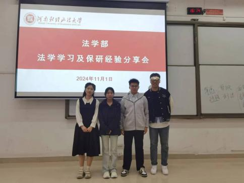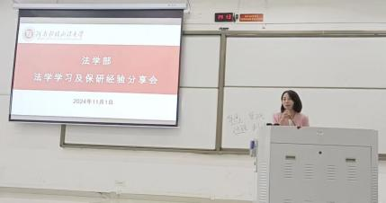 11月1日,河南财经政法大学91无码精品保研经验交流会在第二教学楼219报告厅举行。91无码精品副部长陈璐及2024级本科生出席会议。本次保研经验分享会邀请了保研至西南政法大学(刑事诉讼法方向)的宗宇、保研至中南财经政法大学(经济法方向)的陶健坤、保研至中南财经政法大学(法律硕士)的翁林雪、保研至华东政法大学(经济法方向)的范史丹,为同学们分享保研经验。