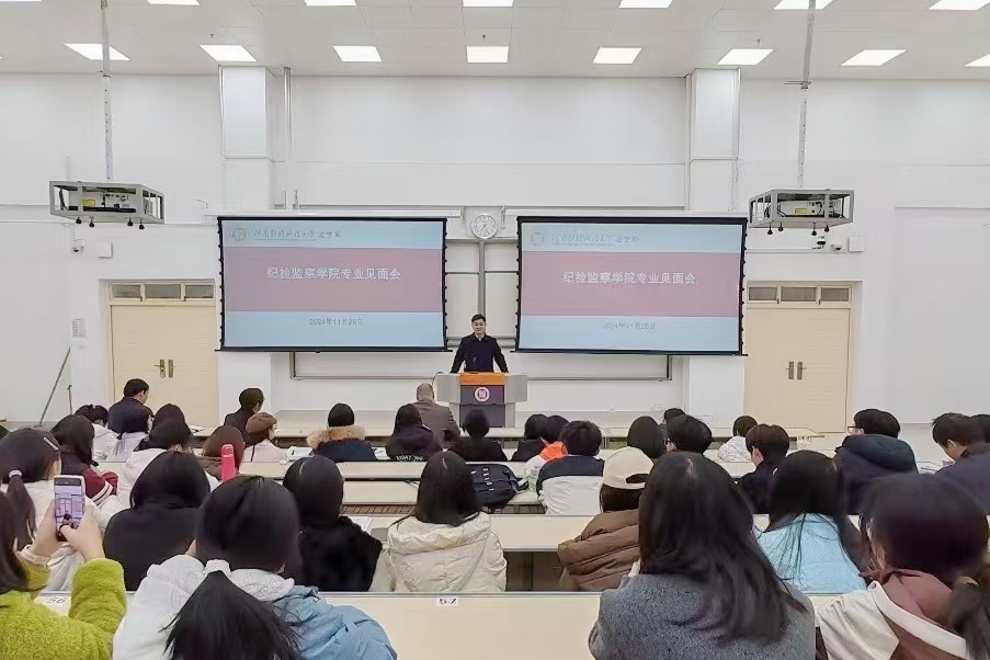 会上,纪检监察学院副院长刘用军教授详细剖析专业就业前景,着重强调在校期间要全方位培养政治素养、思维、表达与专业应用能力,为职业发展谋篇布局。庞慧洁博士深入解读学习规划,鼓励新生积极参与学术活动,于实践中塑造法学思维,磨砺独立思考力,拓展学术与职业发展空间。
