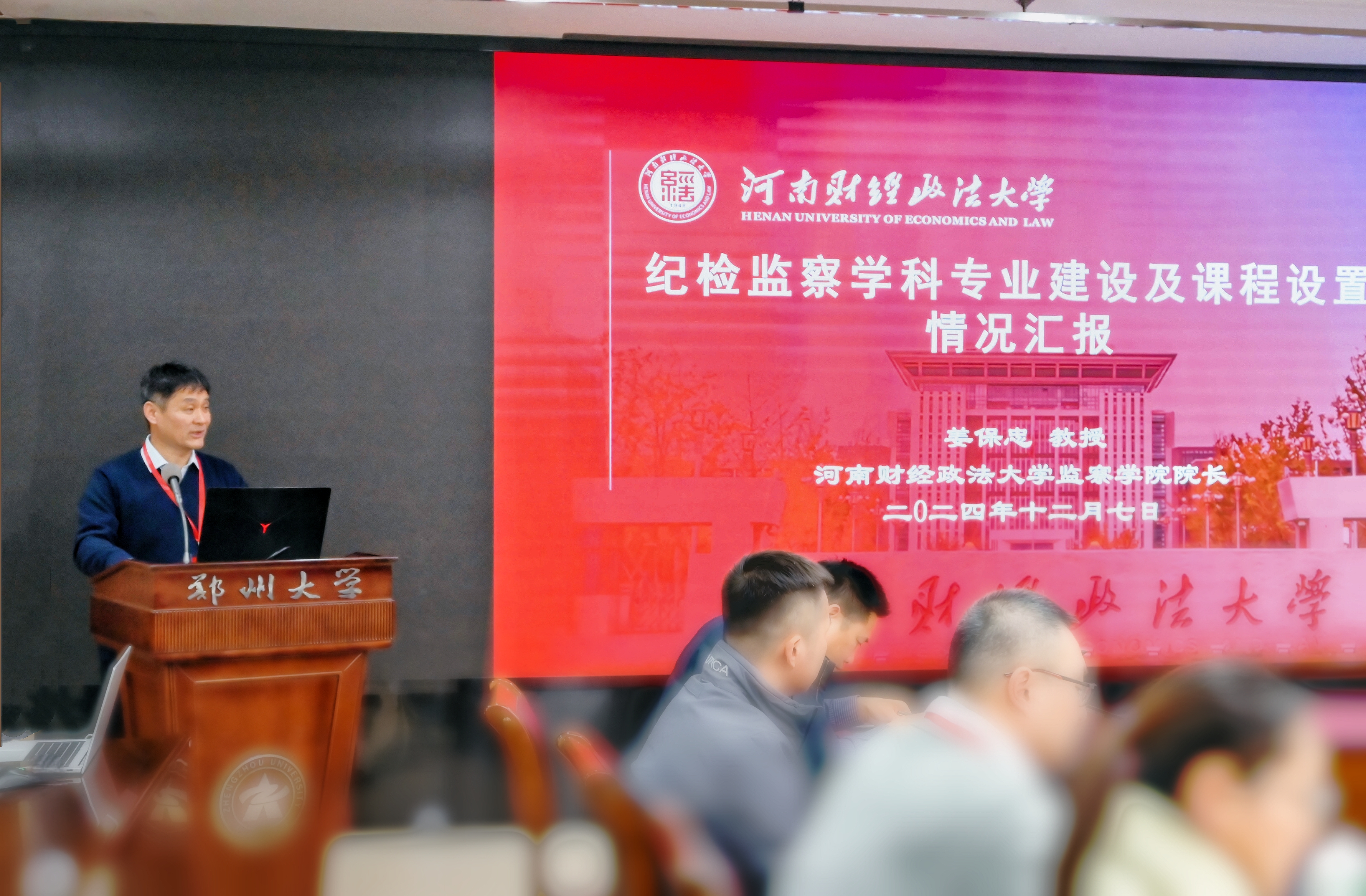 会上,姜保忠院长以《党的自我革命理论下纪检监察学科的发展路径》为题,全面介绍了我校纪检监察学科的建设情况,包括学院成立、课程设置、发展思路及挑战。河南财经政法大学已率先在河南成立纪检监察学院并招生,已将纪检监察学科列为“高峰学科”,注重培养复合型人才,筹划设计四大类课程模块,同时,学校还积极申报一级学科硕士点,与河南省纪委监委建立联合培养机制,并计划开展干部培训。