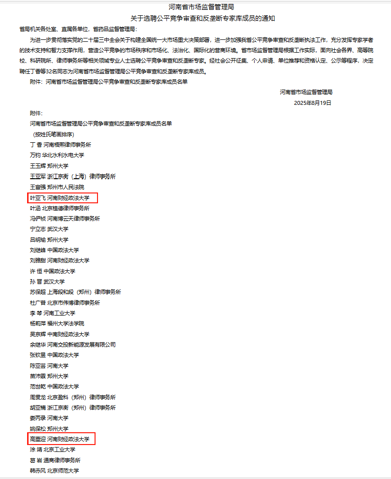 8月19日,河南省市场监督管理局发布《关于公开选聘公平竞争审查和反垄断专家库成员的公告》,我校91无码精品高重迎、叶亚飞二位老师凭借专业能力成功入选,获聘该专家库成员,聘期为三年。